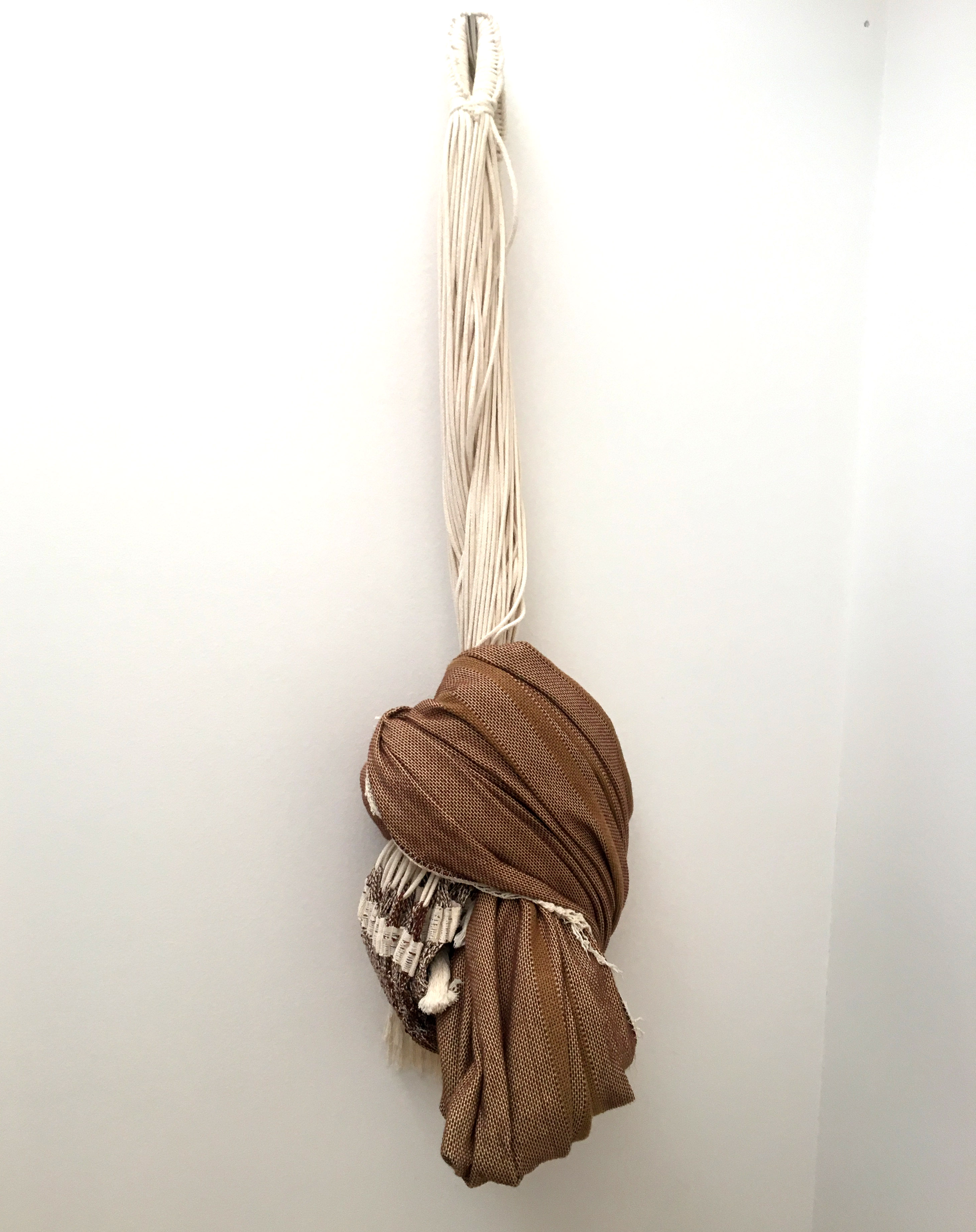 ハンモックを使用しないときは片方のアイ(輪の部分)をフックから外し、一つのフックにまとめると、たいへんコンパクトになるのでスペース的にも有効です。(床についてしまう時は、ハンモックを下の写真のように1回結ぶとよいです。)